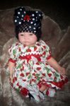 Could you tell me what doll is wearing the sweet little red, green and white dress?