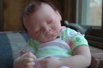 okay, now I was looking and thinking that I would have blushed the tops of her arms and hands. I noticed there were no hand/ finger shots or toes, some like to see the manicures...the stuff my shakey hands mess up everytime.. Now on the hair, it's not a good swirl...I can't get mine like that either, but it would look better if it was scruchedc up.. IMHO. She's a sweet baby. I agree with the remarks made picture shots. They say to put them into something that cradles them. I won an extra moses basket on ebay, so I started putting things in it..like a neck pillow (they now sell them..lol to lift the head, here at Secri) st...lol then I started putting these throws that I found at Big LOt for 15.00 and they were great...faux rabbit fur. Sometimes you can find pieces of fabric at the discount table. They said to uses soft things and no blankets or anything that takes the attention away or off the baby. I found that I stared buying differnt sheer panels for 4.96 each. I threw them over a colored thing and then pulled it around and tucked it in. LOoks very pretty. And then I see someone selling them on ebay for 35.00 and I'll bet it was a container of those popcorn packing stuff and then something wrapped around it and it looked just like mine...LOL And get this..I told mom if I new how to do something t fix eyebrows..I went and bought some white strips to just mark it off with and now there is someone selling stencils for reborns. So..here's my next idea...just maybe someone will do it because I don't have the money to do it. Why not make those eyelashes for dolls be sticky on the opposite side that they have it on for women???? Know what I mean? It would be so easy to use that and then use the paper glaze to seal them to the eye!!!! Okay...give it to Pat S. and see if he can do it. lol I AM serious. I'm going to look for some pictures that showes my moses basket better. I'll post one that will show how you can use just a basket .