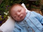 His hair was the new Secrist Angel mohair. It was really nice to work with. I intended to straighten it by spraying with conditioner and putting a sock on it, but it looked so cute curly I decided to leave it as it was.