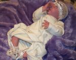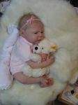 Hi All - This is the baby that looked awful with the rooted lashes. Golly, I have been reborning for 1 year now and this is 5th baby. And I'm getting faster because I started her in July. My biggest problem is still shine. I have read every source I can find on why I get so much shine and how to correct it. And tried EVERYTHING. Before I put on base color for Annie I washed her in Dawn, air dryed, put on a coat of Matte Varnish. I have used both Secrist matte varnished and also one from BB. When I went to Tiny Treasures, the babies in competition had no shine-none. I noticed the surface of the vinyl had a texture (not painting texture) and I am thinking of adding some thickening medium to a base coat. I'm getting a new oven thermometer, a new cookie sheet and a new timer. (My old ones were only a few months old.) Does anyone know about how to apply and how much thickening medium to use in this manner? Also, I did a belly plate for this doll and it had a slightly rougher texture to begin with and I had no shine at all. Go figure. Thanks for reading all this and looking at pics. Sandy p.s. I do like the way she turned out, except for the above.