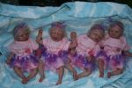 Thank you so much for commenting on my quads Dee. I really didn't notice how bad my pictures are, the mottling on here is way too defined on these pictures, it's not that noticable in real life. And the nails and lips aren't that white or red. however, i used the sweetheart rose paints this time. the bush (i was alittle upset when i got it because it was only half-full and i use more blush than anything, but it is the new kind that is suppost to be more transparent so you use less of it....) , is the color of blood if you put it on very thick, but turns a nice pink after spreading it out some. i also learned that baby tears should NOT be spread on thick or it will turn white. And babytears can be used as glue to apply eyelashes and make eyes moist at the same time. i enjoy doing what i do and it not only makes me really happy, it makes so many other people happy too. i can't wait to begin my next doll, Baby Lulu by adrie stoete. New goals for her will be inserting eyes and creating an asian flesh tone for her. CAN'T WAIT!