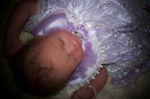 She's such a cute one!!! With such beautifully rooted hair, the only thing I might consider using to cover her head is that cute little hat with the purple flower.