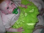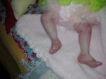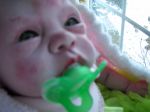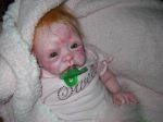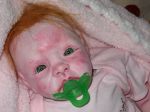 I think you have done quite a good job for your first baby, I think the green dummy detracts her look, especially since she has green eyes, giving her a pink or white dummy would probably tone done her collouring. She does't seem like she has eyebrows, her lips could be a little more smoother, otherwise the blochiness doesn't look bad, it looks nice as a newborn. JIMO> This is ment to be helpfull. XXXXXX June.