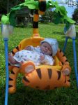 just wanted to show you this little swing i got at the flea market for 2.00. dakotas a 16" baby, so it only for the little ones. it's a fisher price, great for photos. sage